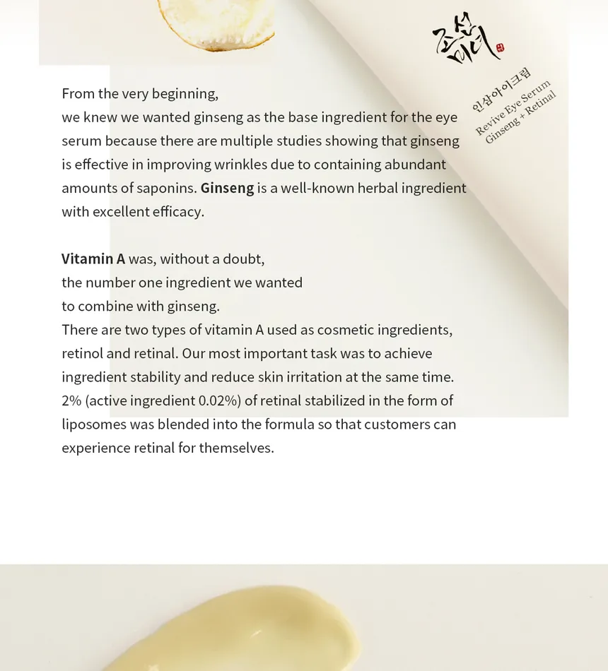 - Infused with 10% Ginseng Root Extract and 2% Retinal Liposome to improves wrinkles over sensitive eye area .